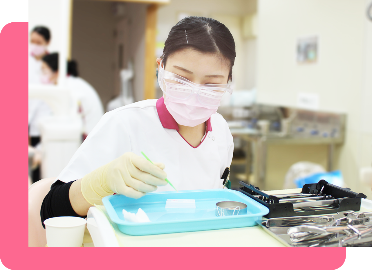 3年間の充実したカリキュラムで、基礎・専門知識を幅広く学び、国家資格取得を目指します。歯科医院や医療施設でのさまざまな校外実習では、実践的な技術を身に付けることができます。